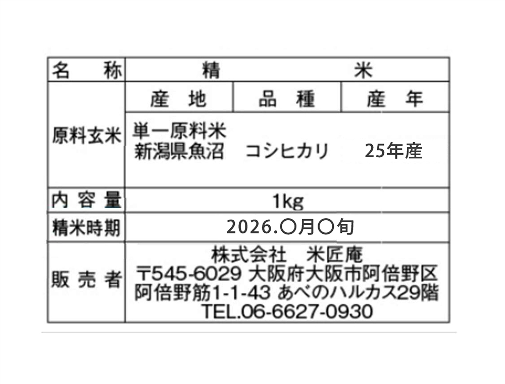 新潟県魚沼産こしひかり1kg(化粧箱入り)