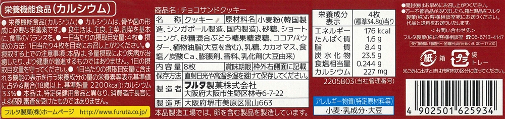 カカオの風味豊かなチョコレートをサクッと香ばしく焼き上げたクッキーでサンドしました。骨や歯の形成に必要な栄養素カルシウムを配合しております。