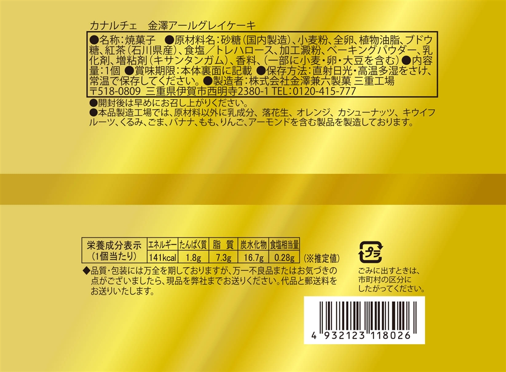 老舗 ・林金沢茶舗の「能登の紅茶」を使用した甘く上品な香りのアールグレイケーキです。