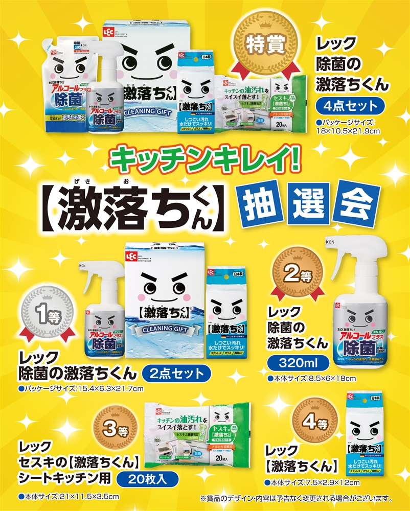| 備考 | <キット内容> 【特賞】レック 除菌の激落ちくん4点セット・・・1本 【1等】レック 除菌の激落ちくん2点セット・・・2本 【2等】レック 除菌の激落ちくん320ml・・・5本 【3等】レック セスキの【激落ちくん】シートキッチン用20枚入・・・7本 【4等】レック 【激落ちくん】・・・35本 <付属品> 抽選くじ×50、抽選箱×1、くじ明細書×1、告知用A4カード×1 ※賞品の内容・仕様は画像と異なる場合があります。あらかじめご了承ください。 |