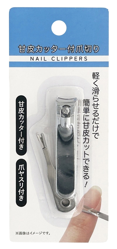 軽く滑らすだけで簡単に甘皮をカットすることができる甘皮カッターと爪切りが1つになった商品です。爪やすり機能付き。