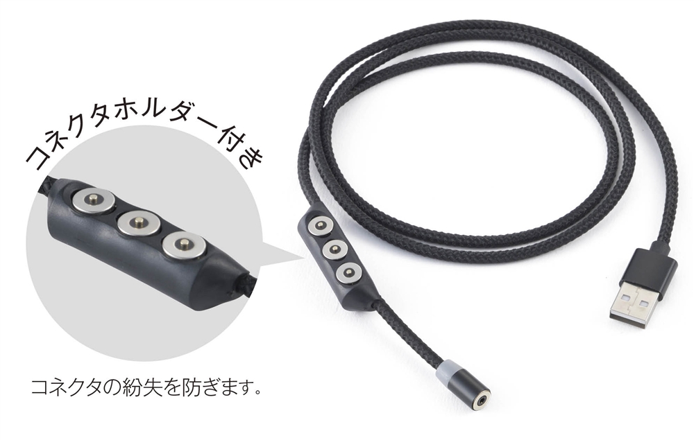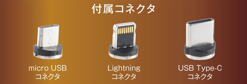 | 備考 | <セット内容> マグネット式ケーブル・micro USBコネクタ・Lightningコネクタ・USB Type-Cコネクタ・コネクタホルダー |