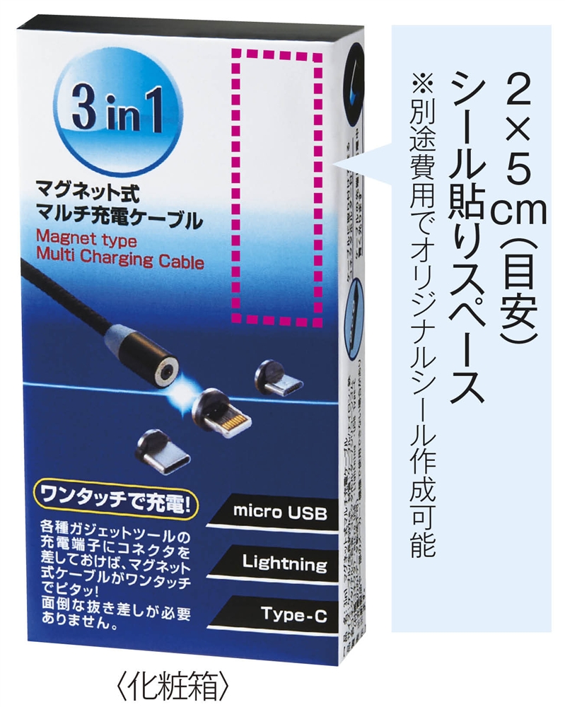 一般的な3種のコネクタがセットされており、紛失防止のホルダーも付属しています。ガジェットにコネクタを挿しておけばホコリよけにもなり充電がワンタッチで始められる!化粧箱にはシール貼りスペース(およそ2×5cm)も設けています。※シール作成は別途費用がかかります。