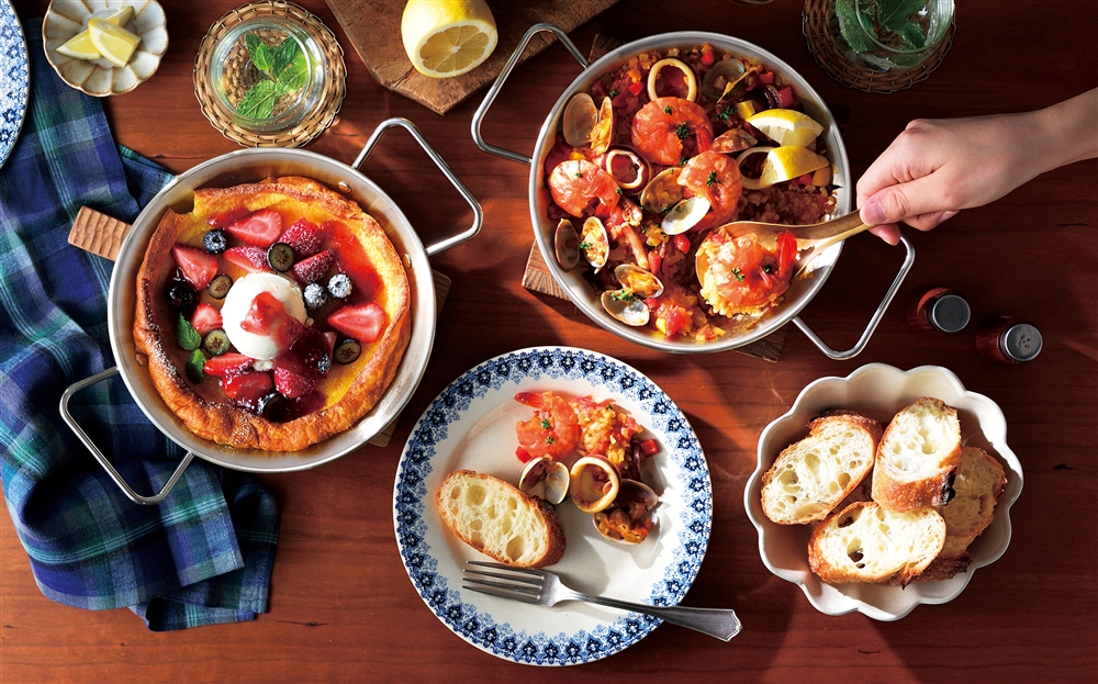 最近流行のキャンプ・BBQやベランピングなどにも最適で、おススメレシピも付いていますので食材の準備なども楽チンです。レシピにはシーフードパエリア/ダッチベイビー(ドイツ風パンケーキ)/パンキッシュ/お好み焼き が記載されています。