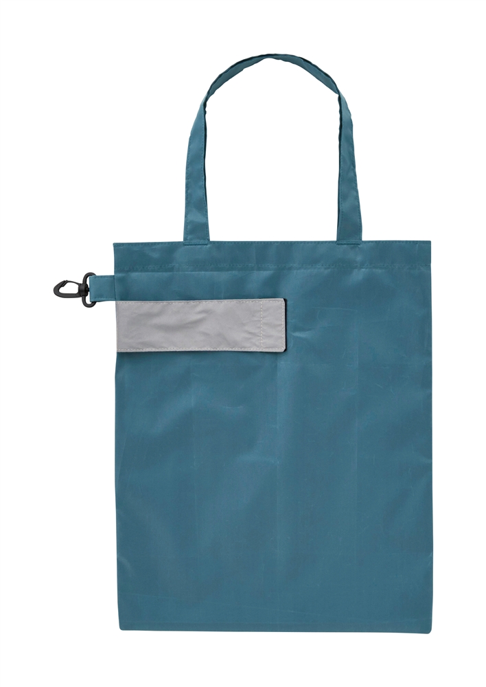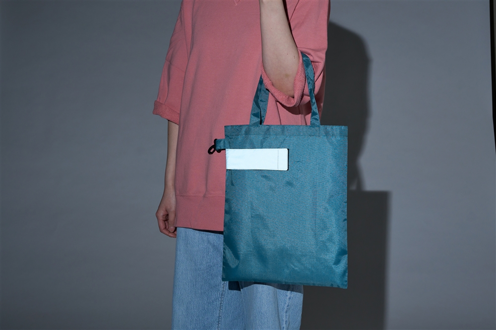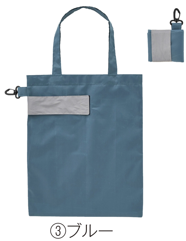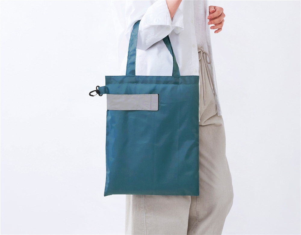 A4サイズが入るエコバッグは小さく折りたためて携帯にも便利。暗くなると、たたんだ状態でもリフレクターが光ります。どこでも取り付けられるカラビナ付き。シニア層も抵抗なく持てるベーシックな4色の中から色指定が可能です。
