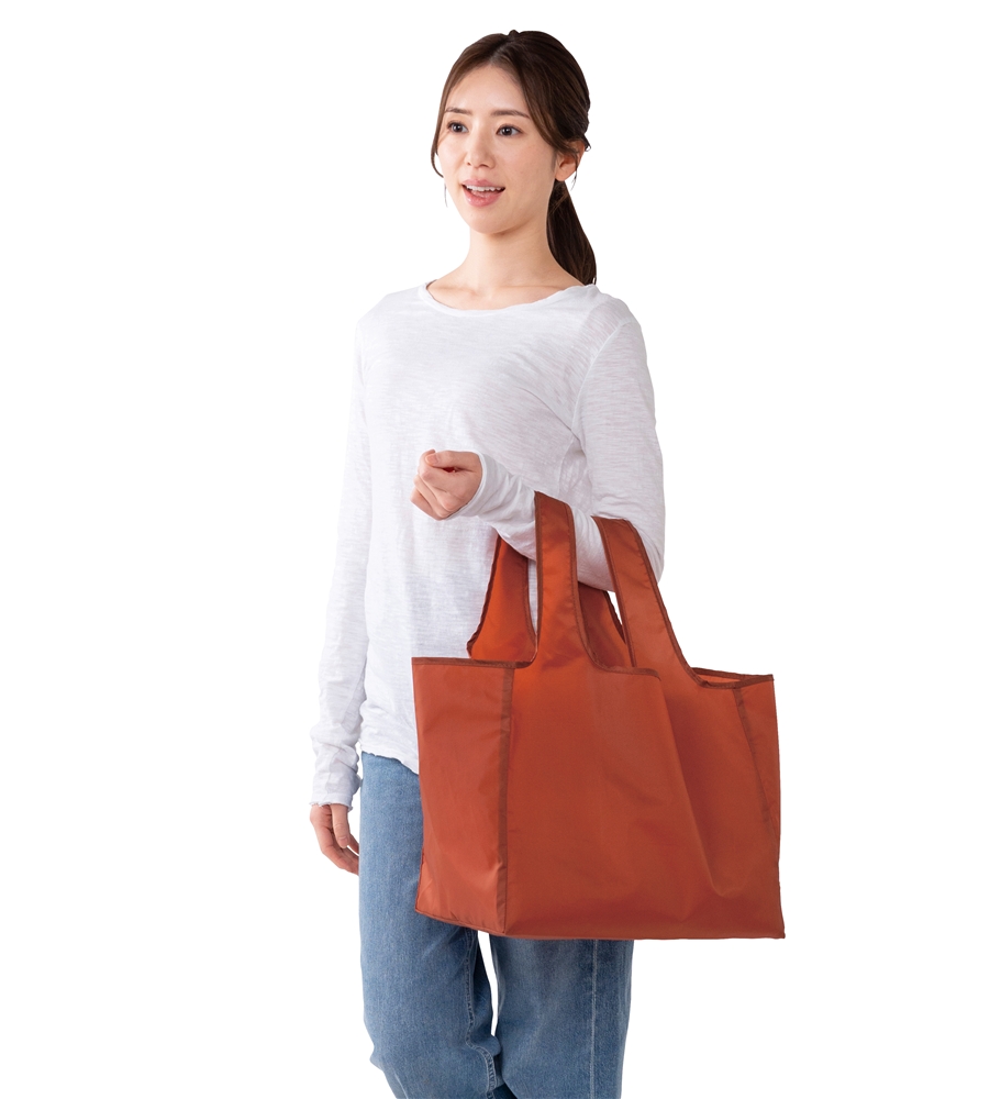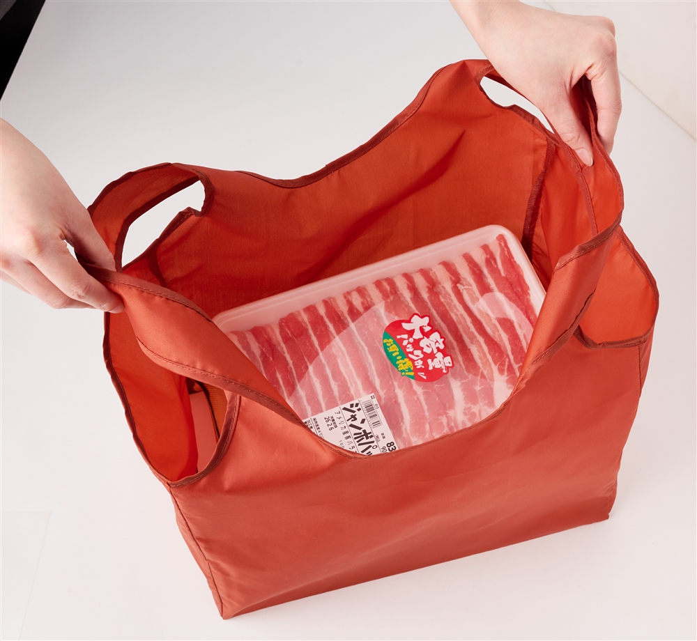 自転車のカゴにも収まりやすく、トレー付きの食材も平置きできるマチ広のエコバッグ!選べる4色展開