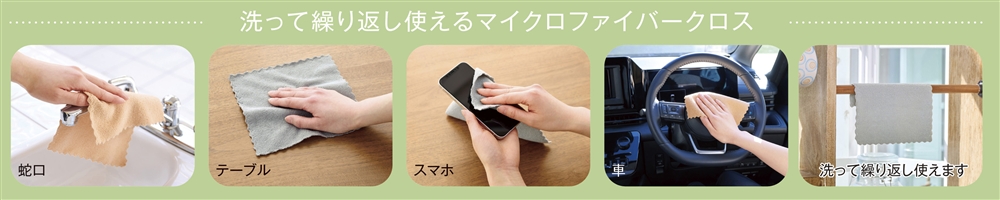 テーブルやキッチン、洗面台などの水回りをはじめ、スマホやTV画面、車のハンドルなどのよく触れる場所をササっと拭きたい時に最適なマイクロファイバークロスです。使い捨てではなく、洗って繰り返し使えてサステナブル! ティッシュのようにサッと取り出せるボックス入り。