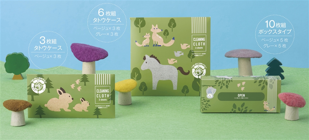 森のどうぶつたちがデザインされたパッケージに、毎日の拭き掃除に使えるマルチクロスが入っています