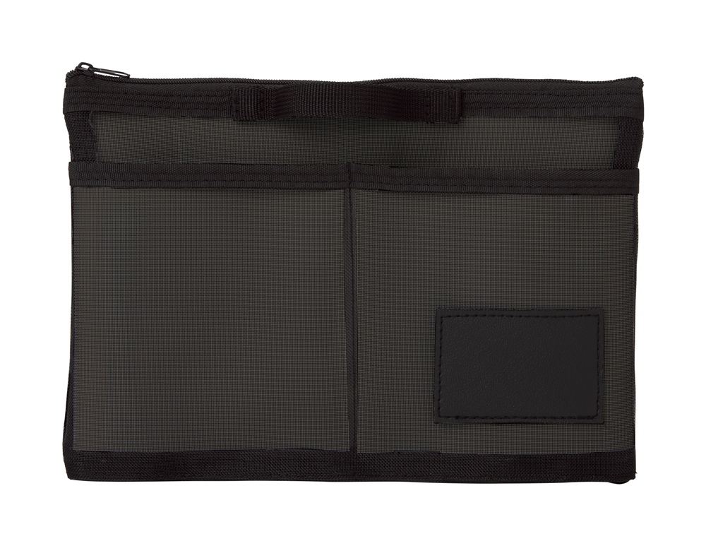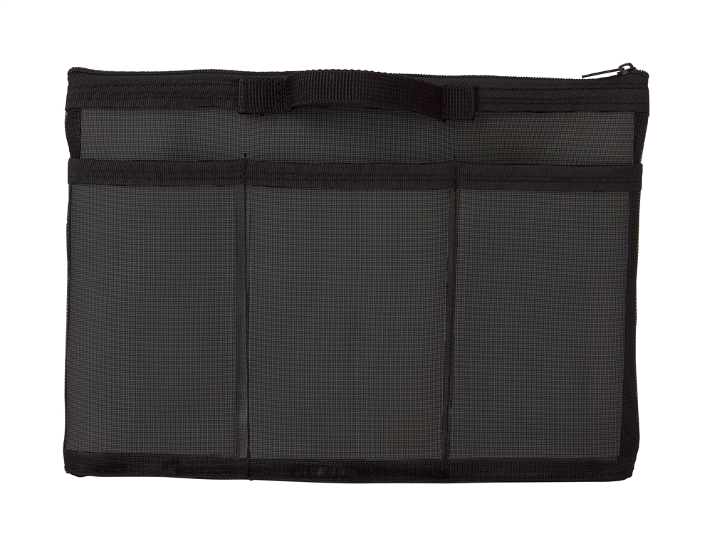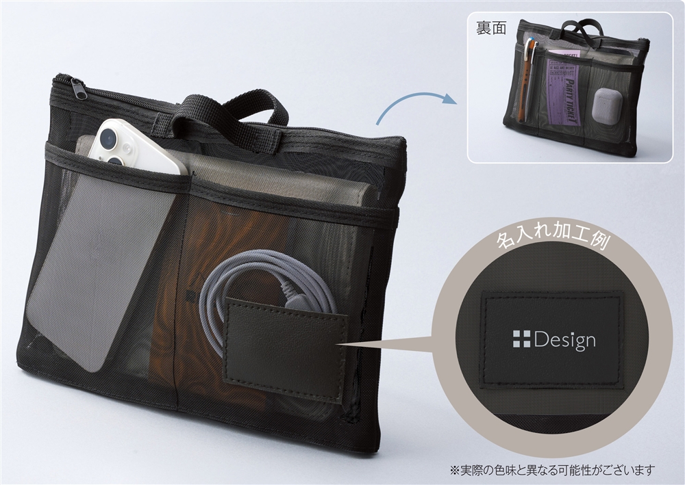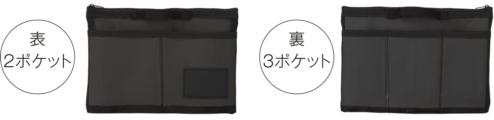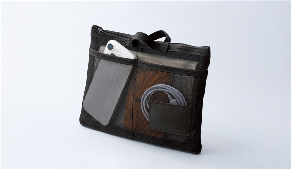 バッグ本体のほか、表に2つ、裏に3つのポケットで小物を整理できます。持ち手付きでこれ単体でも持ち運びしやすい。中が見えるメッシュ素材なので、モノを探す手間が省けて整頓上手に。