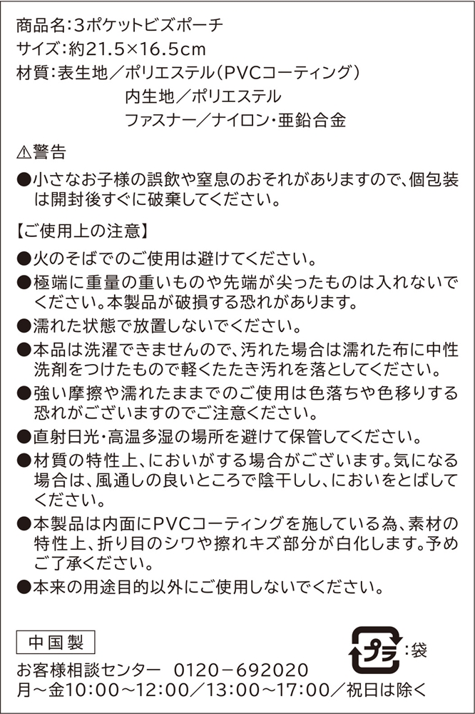 | 素材 | 表生地/ポリエステル(PVCコーティング) 内生地/ポリエステル ファスナー/ナイロン・亜鉛合金 |
