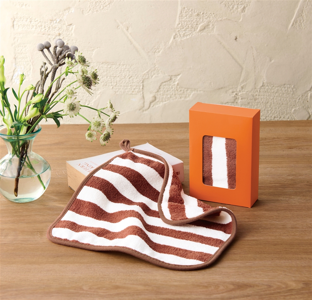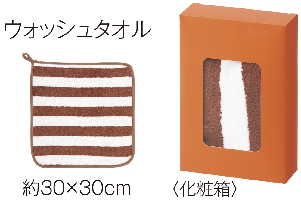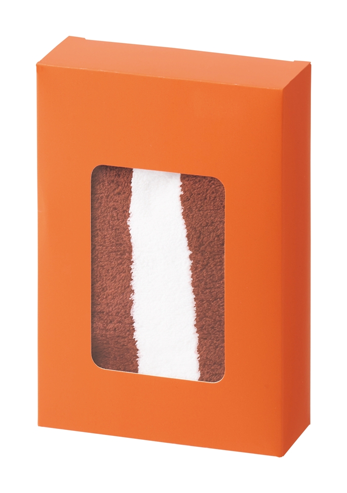 普段使いにぴったりなカジュアルなストライプ柄のタオル。中身が見える、あざやかなオレンジ色の化粧箱入り