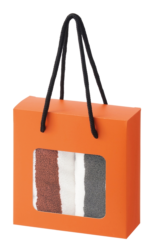 カジュアルなストライプ柄のタオルセット。中身が見える、あざやかなオレンジ色の持ち手付き化粧箱入り