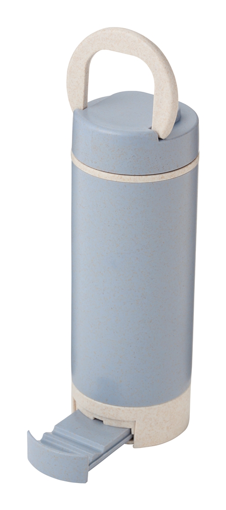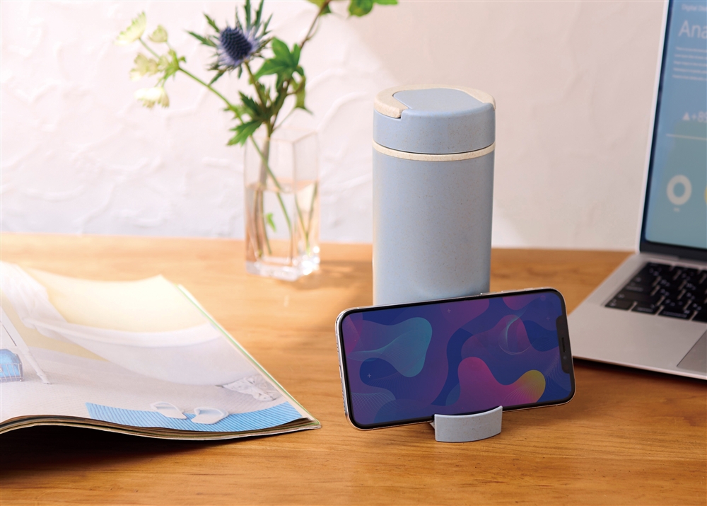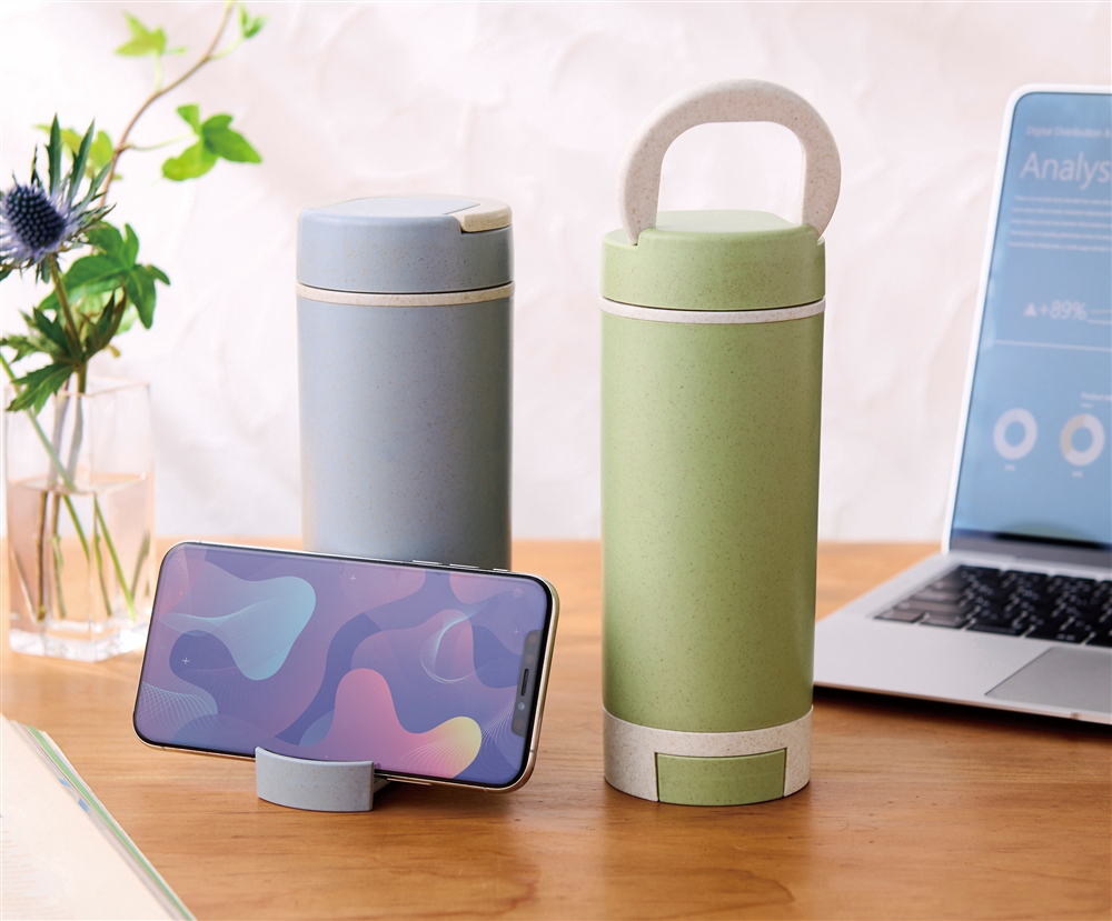 ボトル下部のパーツをスライドして引き出すとなんとスマホスタンドに。エコ素材として認知度の高い竹繊維を使用しているので、SDGsや環境配慮のPRという側面も持っています。便利なハンドル付きで持ち運びもラクラクです。 さわやかなブルーとグリーンの2色展開