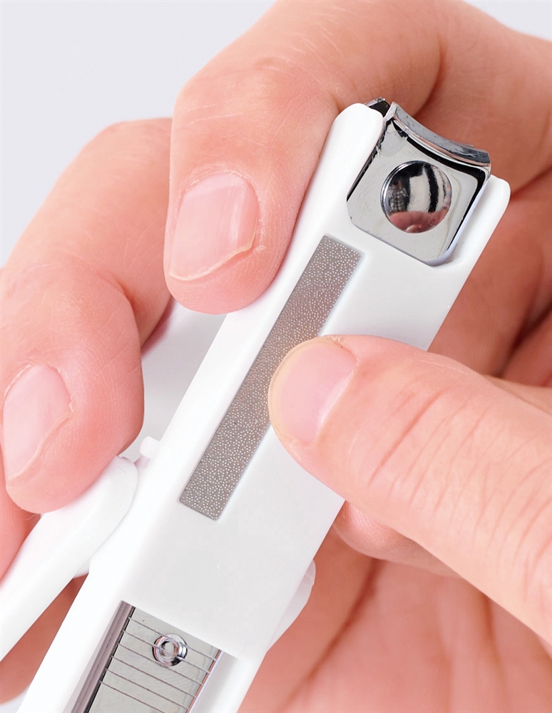爪切りに便利なレンズが付きました。レンズは角度調整も可能です。刃先は自然なカットに仕上がる曲線刃で、本体にはカバー(キャッチャー)付きなので切った爪が飛び散りません。最後にやすりで整えたら、大人の身だしなみは完璧です!