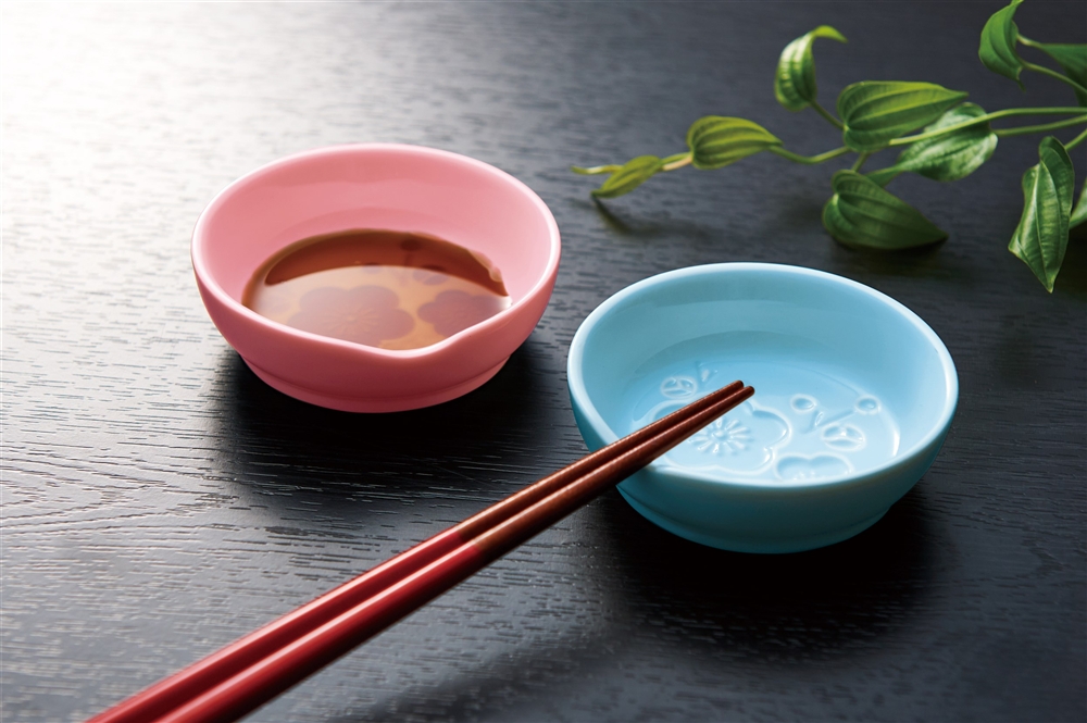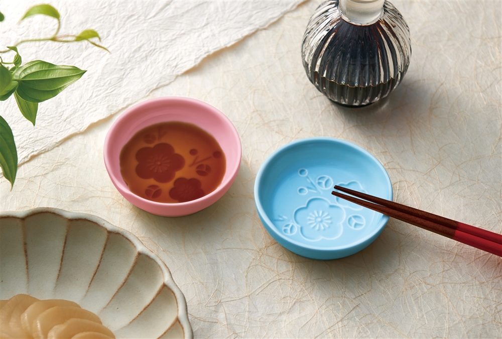 【旧来ご提供単価199円】お醤油を入れると可憐な梅の花が浮かび、箸置きにもなるくぼみが付いたかわいい小皿のペアセット