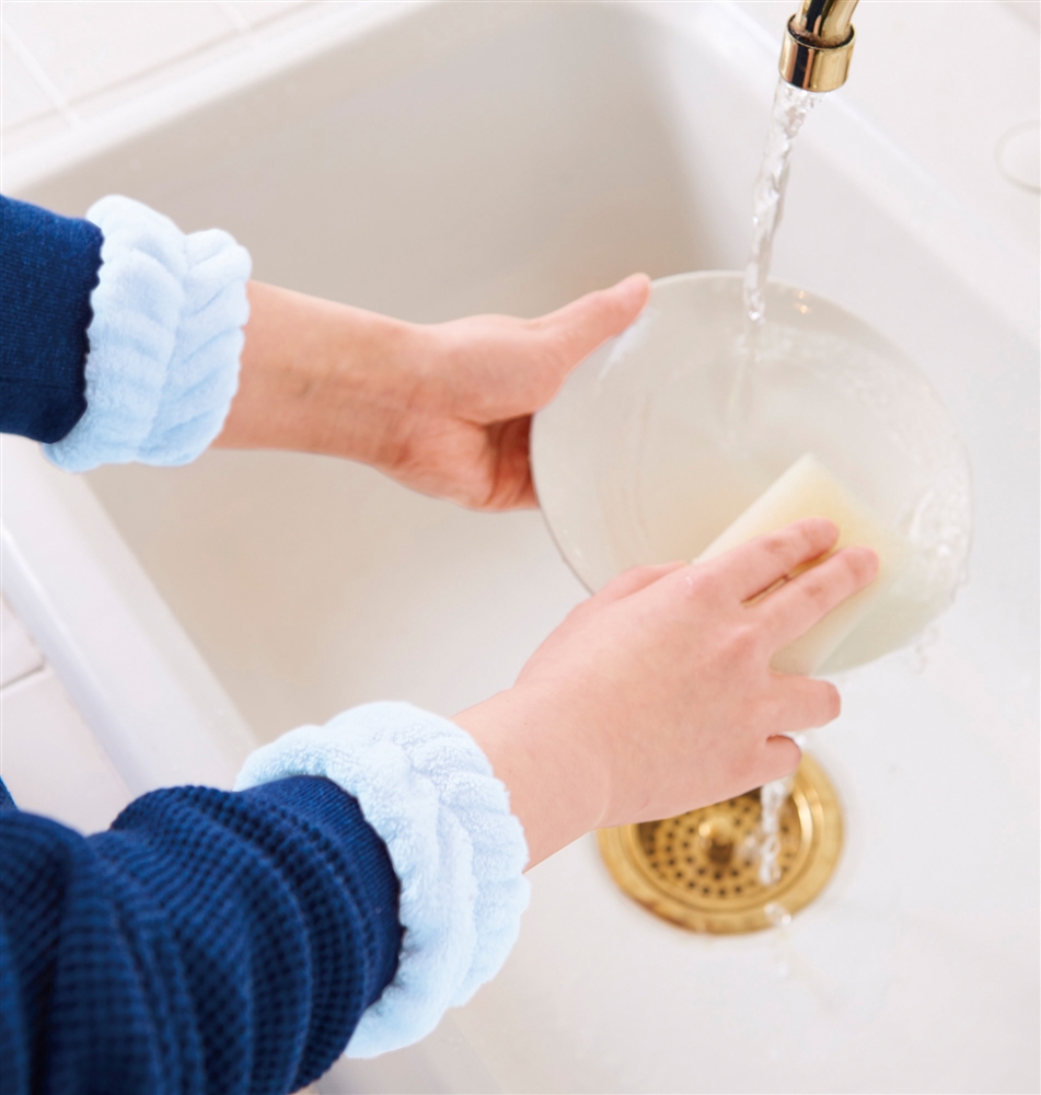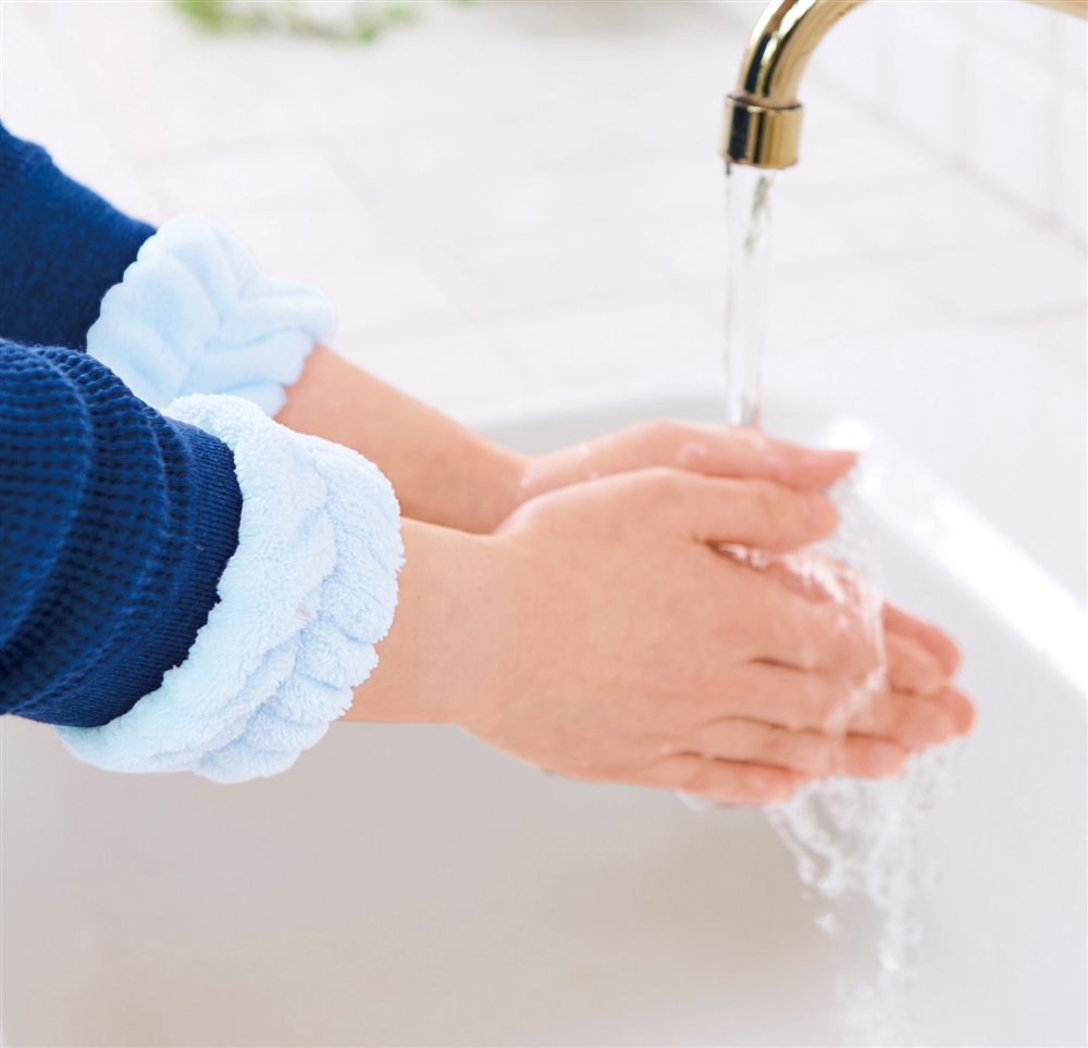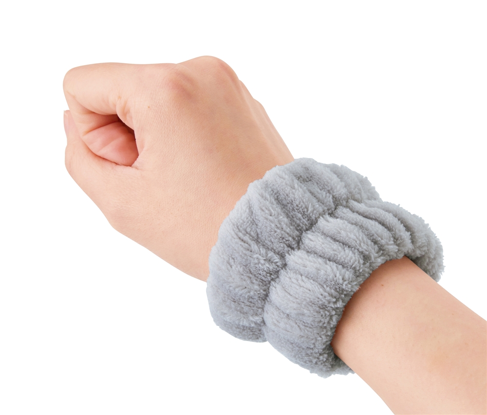 ふわふわ触感が気持ちいいリストバンド。洗顔時や洗い物をする時に、服の袖や床を濡らさずに快適に使用できます。長袖の季節には袖濡れ防止として、半袖の季節には腕濡れ防止として一年中活躍!