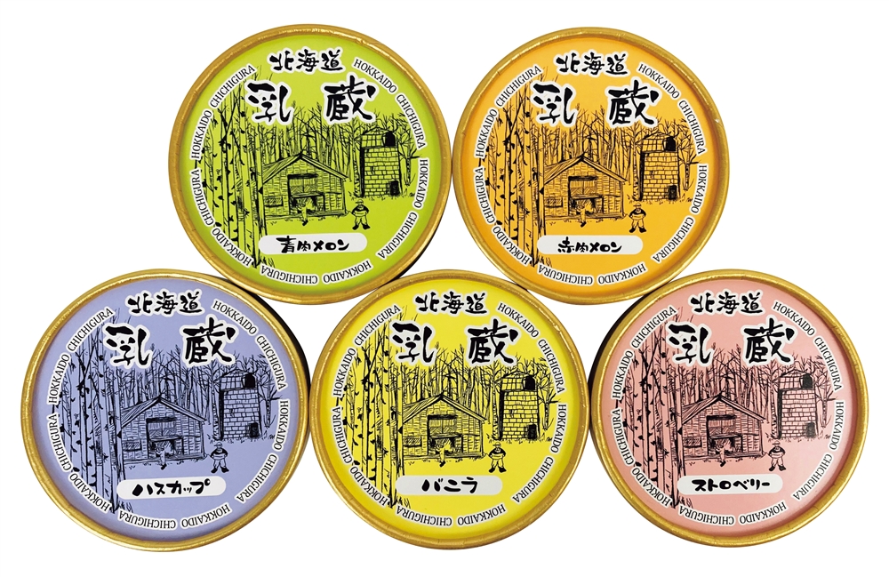 北海道特産果実のハスカップをはじめ赤肉メロン、ストロベリー、定番のバニラとバラエティ豊かな果物のアイスクリームのセットです。