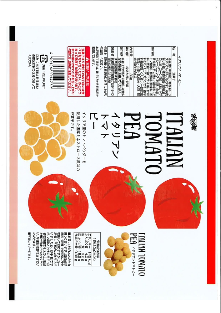 イタリア産のトマトパウダーを使用した濃厚ミネストローネ風の豆菓子です。