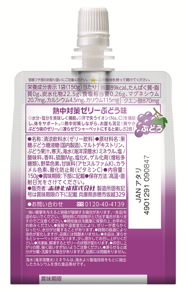 汗に近いイオンバランスを再現しています。熱中対策だけでなく、凍らせて保冷剤として食事の置き換えなどにも使用されております。おいしいぶどう味。