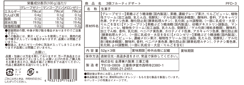 | 備考 | <セット内容> マンゴープリン・熟果ゼリーグレープ・熟果ゼリーメロン各52g×各1 |