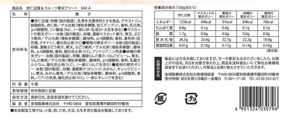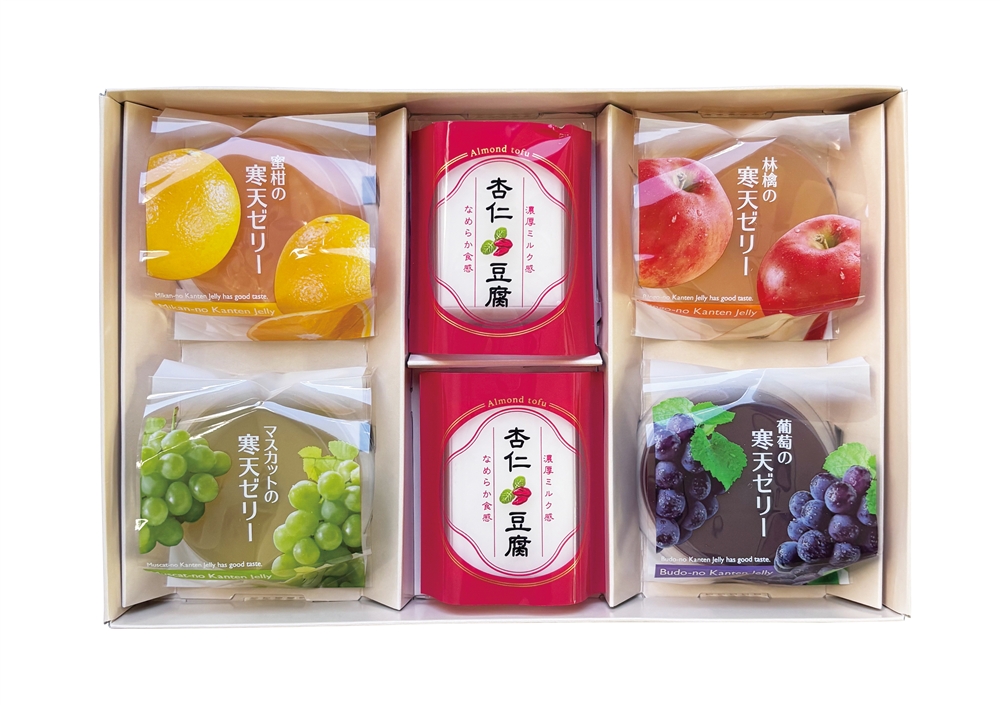 | 備考 | <セット内容> 杏仁豆腐×2 マスカットの寒天ゼリー・葡萄の寒天ゼリー・林檎の寒天ゼリー・蜜柑の寒天ゼリー×各1 |