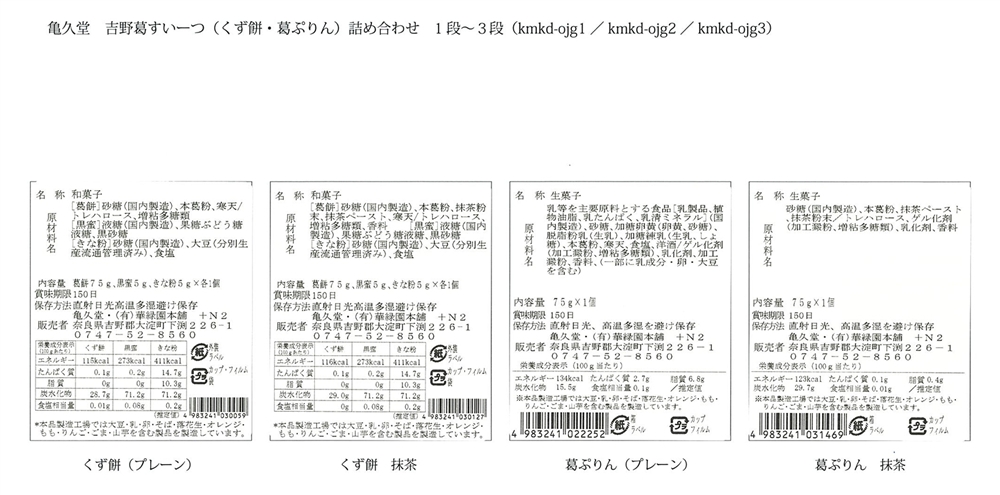 | 備考 | <セット内容> くず餅プレーン75g(別添黒蜜5g・きな粉5g)・くず餅抹茶75g(別添黒蜜5g・きな粉5g)・葛ぷりんプレーン75g・葛ぷりん抹茶75g×各1 |