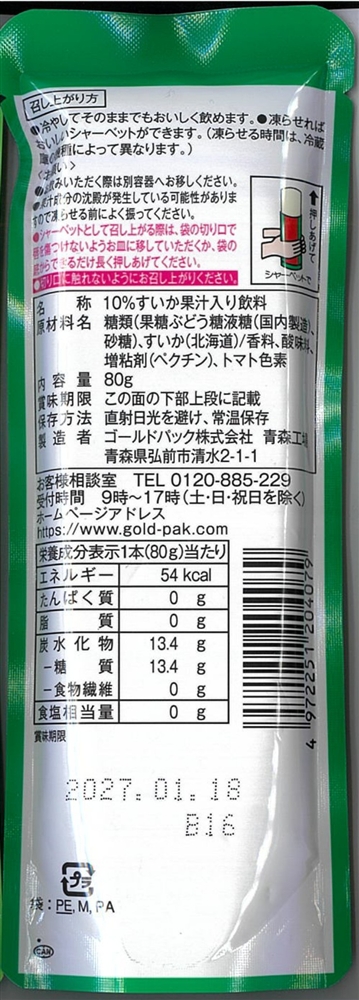 北海道産のらいでんスイカのおいしさをシャキッとシャーベットでお楽しみいただけます。ハンディータイプの形状で、そのまま凍らせれば片手で押し出しながら、いつでもどこでもお手軽に召し上がれます。製氷機などに移して凍らせれば、おしゃれなデザートに変身します。