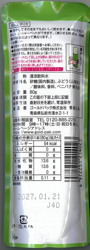 山梨県産のシャインマスカットを使用しています。 ハンディータイプの形状で、そのまま凍らせれば片手で押し出しながら、いつでもどこでもお手軽に召し上がれます。製氷機などに移して凍らせれば、おしゃれなデザートに変身します。