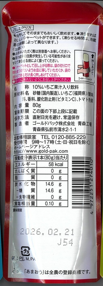 イチゴの一大生産地、福岡県で有名な品種のあまおうを使用しています。あまおうはその名の通り、 あかい・まるい・おおきい・うまいの四拍子の揃った大粒で甘いイチゴの王様です。ハンディータイプの形状でそのまま凍らせれば、片手で押し出しながらいつでもどこでもお手軽に召し上がれます。
