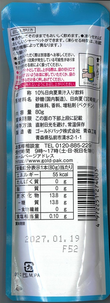 日本一の生産地、宮崎県産の日向夏を使用しています。 日向夏の甘酸っぱい、さわやかな風味が夏にぴったりの味わいです。ハンディータイプの形状で、そのまま凍らせれば片手で押し出しながら、いつでもどこでもお手軽に召し上がれます。製氷機などに移して凍らせれば、おしゃれなデザートに変身します。