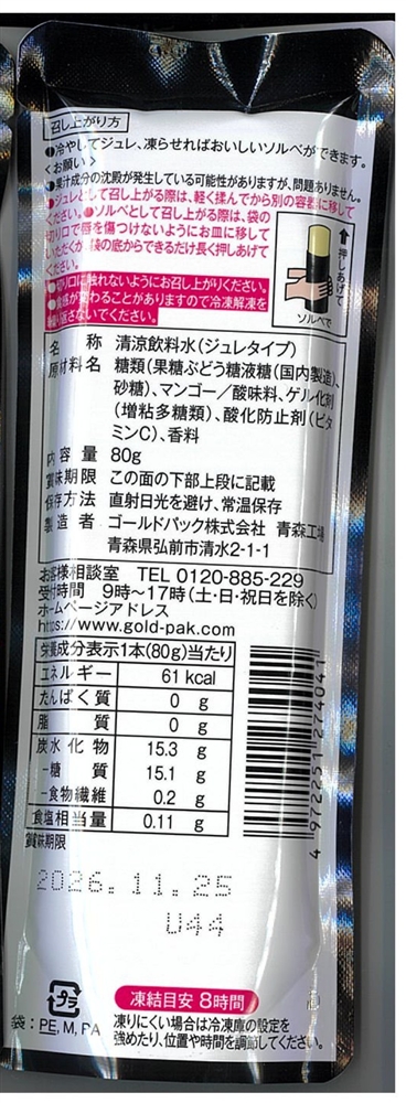 マンゴーの王様ともいわれる「アルフォンソマンゴー」を使用。濃厚なマンゴーの味わいを冷やしてジュレ、凍らせてソルベと二通りでお楽しみいただけます。ジュレタイプなので凍らせてもガリガリとした食感が少なく、シャリシャリ、モニュッとしたなめらかで少し贅沢なくちどけです。ちょっとしたご褒美にぴったりの食べきりサイズ。脂質0gのギルティフリーなおやつです。