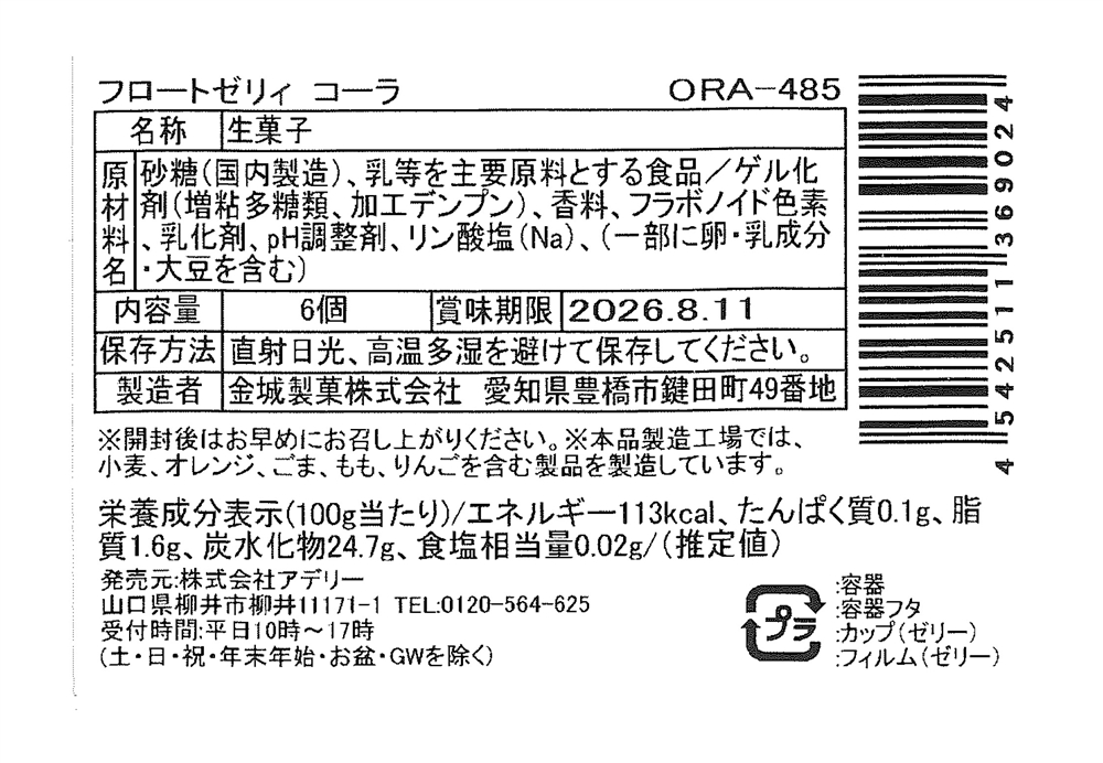 | 備考 | <セット内容> プチコーラフロートゼリー×6 |