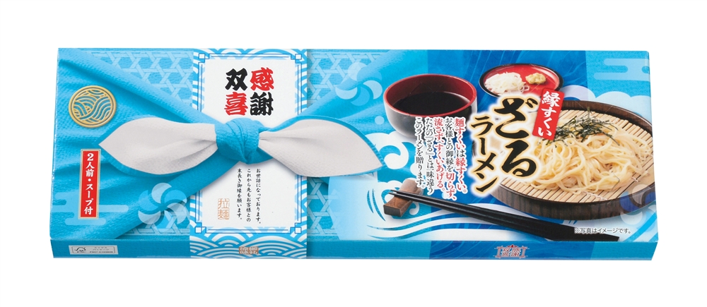 つけ麺方式で食べるざるラーメンは喉越しがよく、暑くて食欲がない時でもつるっと食べられます。商品名の「双喜」は双喜紋の 「喜」を2つ重ねて「二重の慶事」という意味です。名刺等のカードを差し込めるパッケージです。パッケージに名刺やカードを差し込んで、ありがとうの気持ちを商品にのせて伝えることもできます。