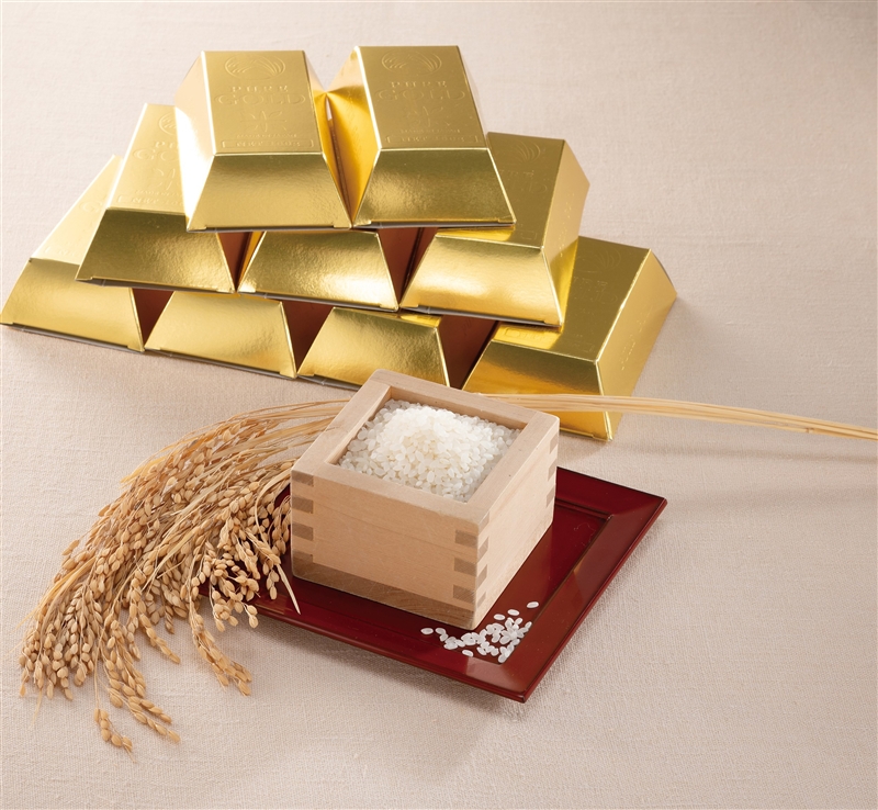 金塊型のパッケージに100gのお米をセット!店頭に積み上げれば注目度抜群のPOPになります。