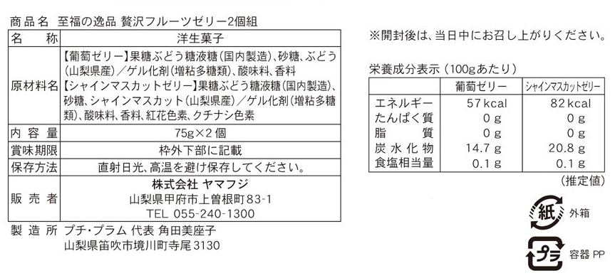 | 備考 | <セット内容> 山梨県産シャインマスカットゼリー×1 山梨県産葡萄ゼリー×1 |