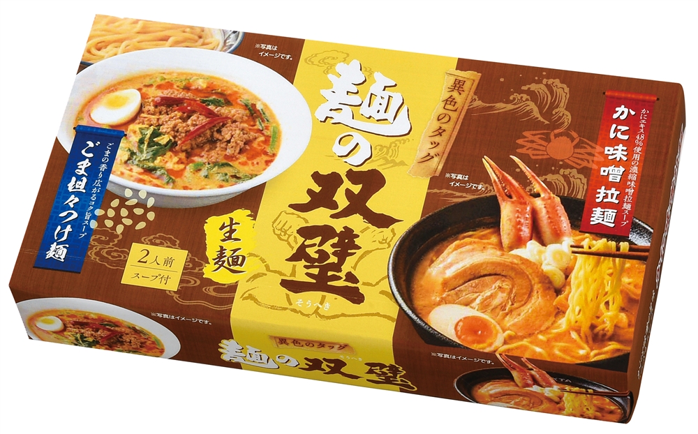 濃厚かに味噌ラーメンと、ごまの香りが広がるコク旨つけ麺が楽しめる2種の麺&スープセット。