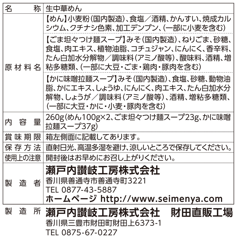 | 備考 | <セット内容> 麺100g×2 ごま坦々スープ23g×1 かに味噌スープ37g×1 |