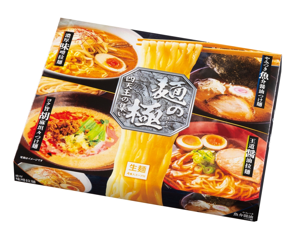 醤油・味噌ラーメンと魚介醤油・担々麺つけ麺の4種類。まさに「麺の極」と言えるラーメンとつけ麺のセット。一人暮らしにもおすすめ。購入者特典や会員特典にも最適です。いつでも贈って喜ばれるラーメンセットですが、「手に取り食べてみたくなる」パッケージも魅力です。
