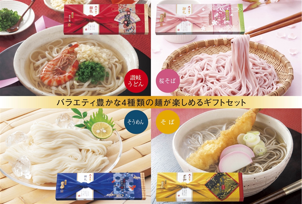 | 備考 | <セット内容> 桜そば180g(2食)×1 そうめん200g(2食)×1 讃岐うどん200g(2食)×1 そば180g(2食)×1 |
