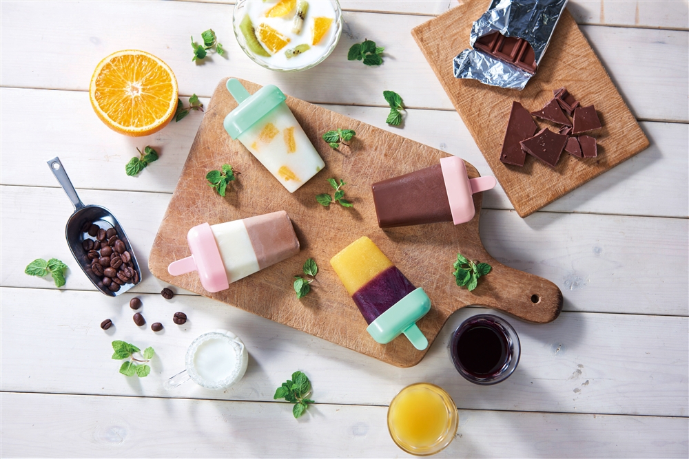 暑い季節は、涼しいおうちの中で楽しくおやつ作り♪小さめサイズなのでお子様のおやつにぴったり!親子で楽しめる4種類のレシピ付きです(オレンジジュース&グレープジュース/ヨーグルト&フルーツ/カフェオレ&ミルク/アーモンド入り濃厚チョコレート)。