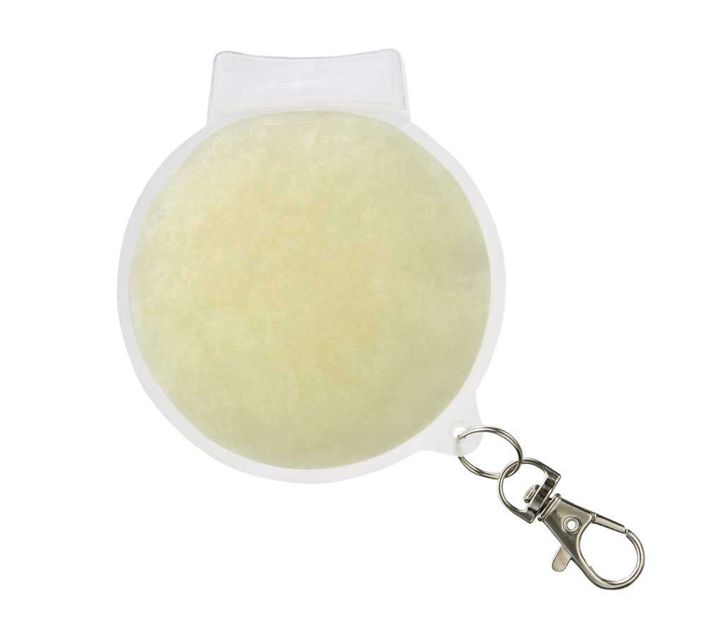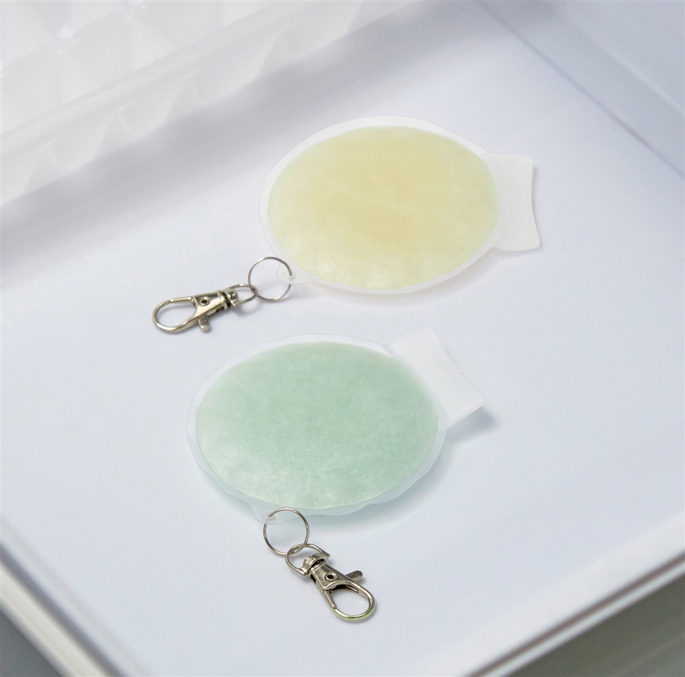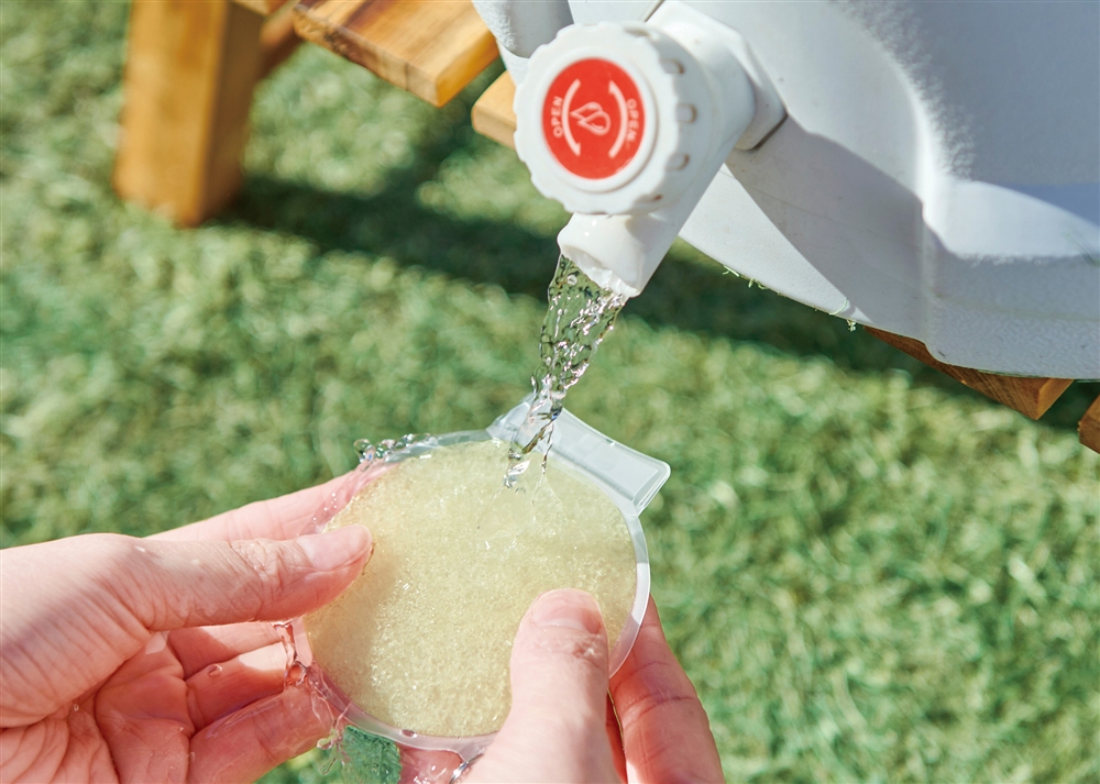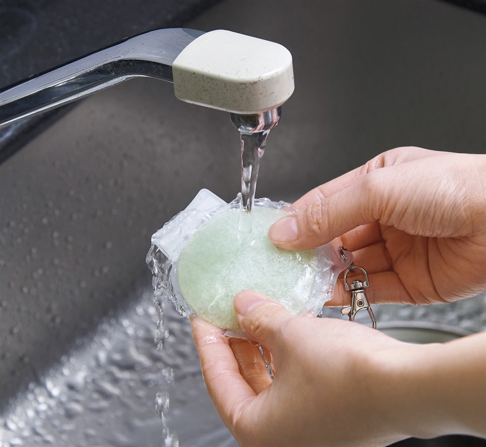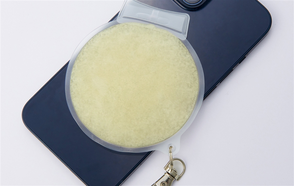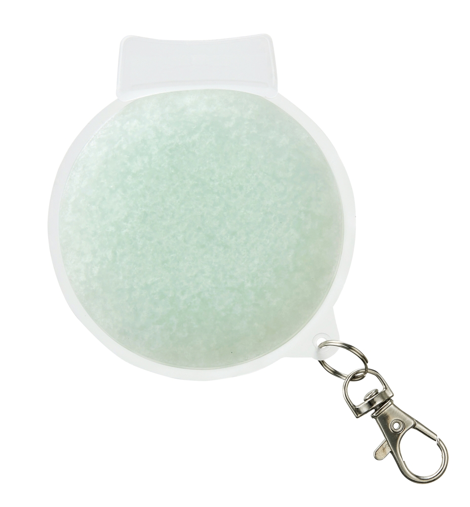 約28℃以下で自然凍結するPCM素材を使用しており、冷凍庫はもちろん、水道の流水でも凍結します。頬やおでこにも当てやすく、名入れも目立つサークル型。炎天下で熱くなってしまったスマートフォンなどの冷却にも使えます。