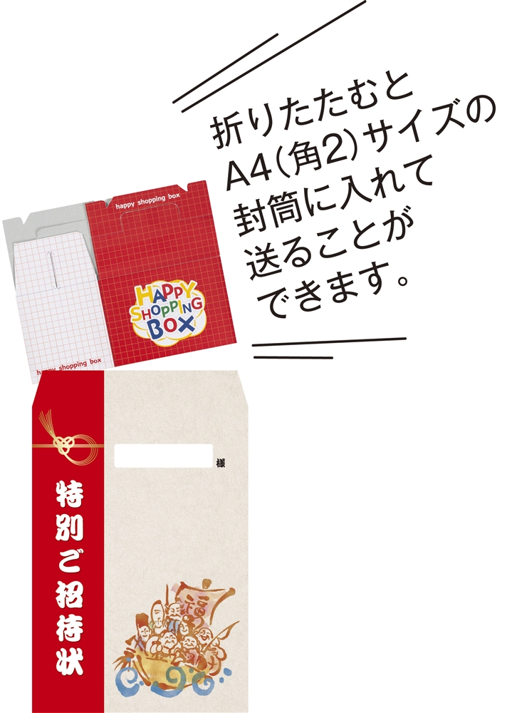 たたんで角2(A4)サイズの封筒で発送できる!来店誘因策に最適の詰め放題BOXです!