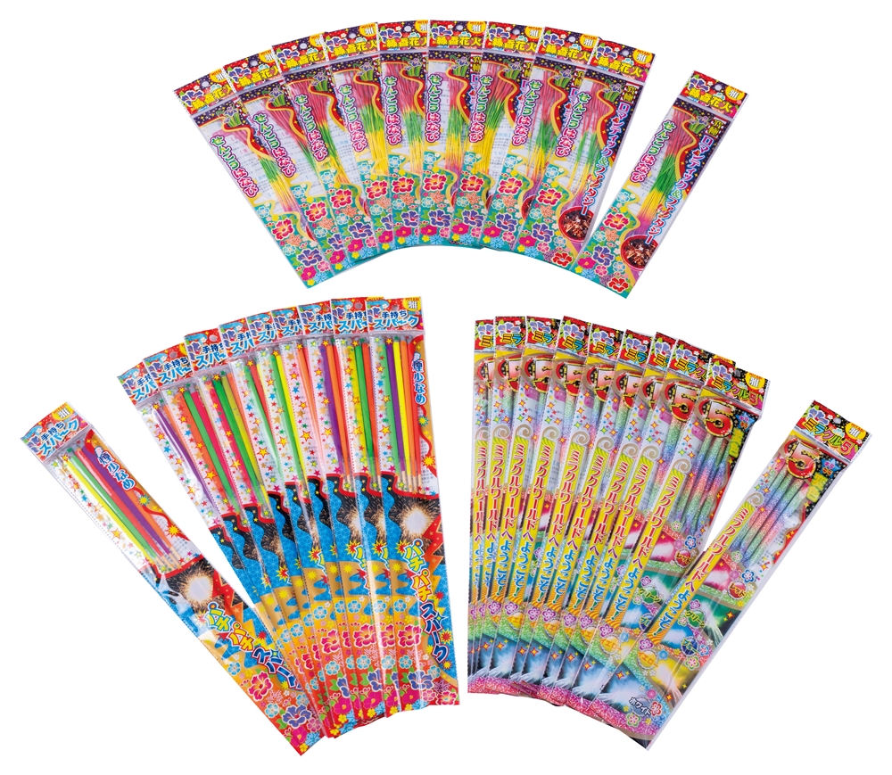 | 備考 | <セット内容> 線香花火(20本入)×10 手持ちスパーク(5本入)×10 ミラクル5ススキ(5本入)×10 |