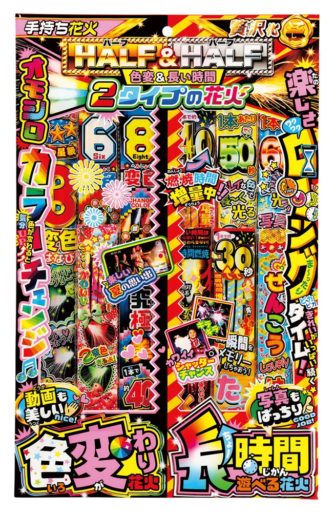 | 備考 | <キット内容> 【特賞】ハーフ&ハーフ 色変&長い時間・・・5本 【1等】はなびーずL・・・5本 【2等】はなびーずS・・・5本 【3等】はなびーずXS・・・5本 【4等】おきがるはなび・・・10本 <付属品> 抽選くじ×30、抽選箱×1、くじ明細書×1、告知用A4カード×1 ※賞品の内容・仕様は画像と異なる場合があります。あらかじめご了承ください。 |