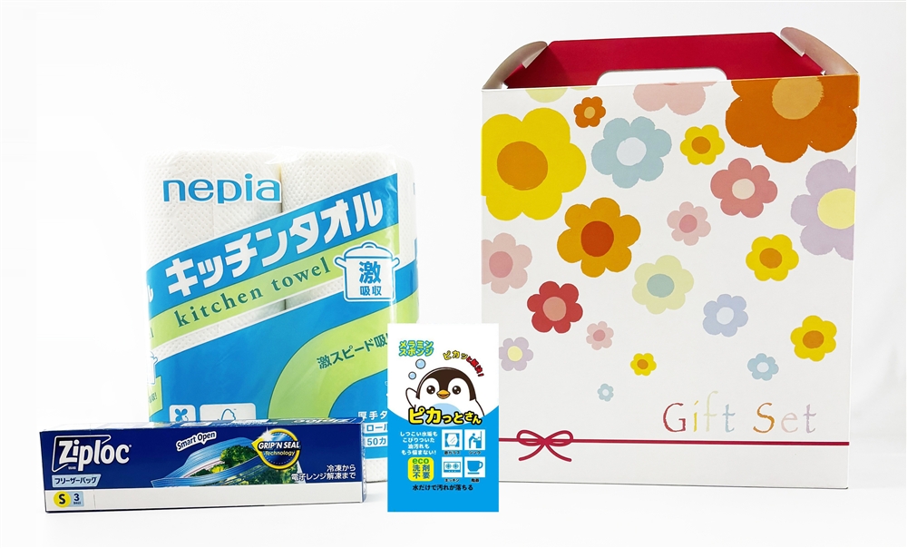 | 備考 | <セット内容> ・ネピア激吸収キッチンタオル2ロール(50カット)×1 ・ピカッとさんメラミンスポンジ×1 ・ジップロックフリーザーバッグS3枚×1 |