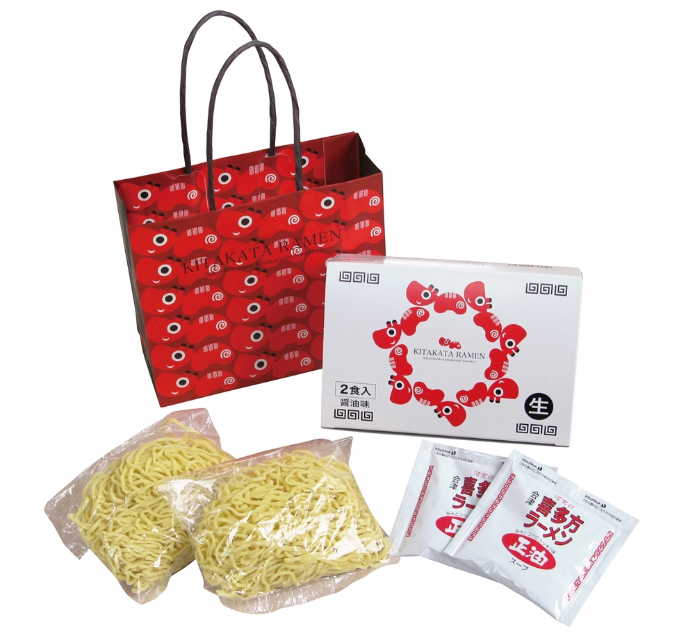 日本三大ラーメンの喜多方ラーメンです。可愛い赤べこの手提げにセット済みです
