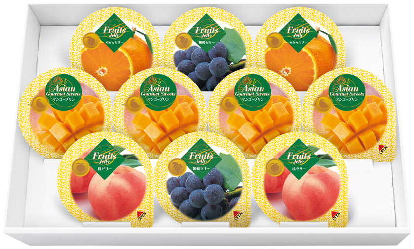 | 注意事項 | 内容量/52g×10個(マンゴープリン×4・葡萄×2・桃×2・みかん×2)、賞味期間/製造日より180日 |