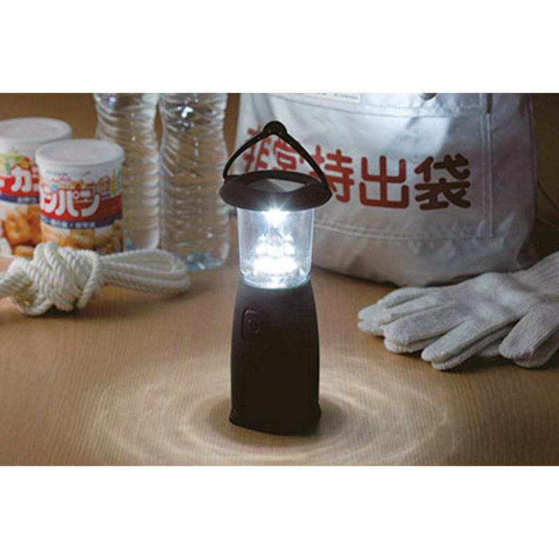 3灯、6灯の2モードで店頭切替が可。ソーラー充電とダイナモ充電のダブル充電で緊急時も大活躍します。4時間ソーラー充電すると、約1時間点灯します。ダイナモハンドルを30分間(毎分30回転)回し続けると、約1時間点灯します。